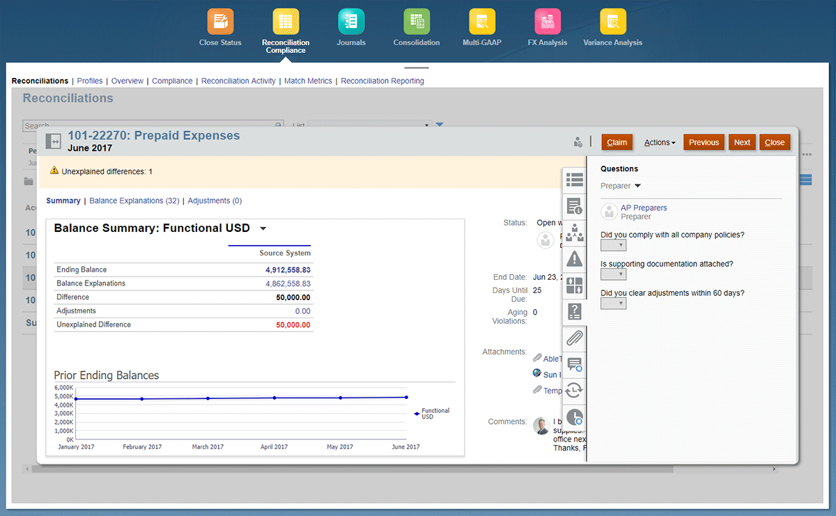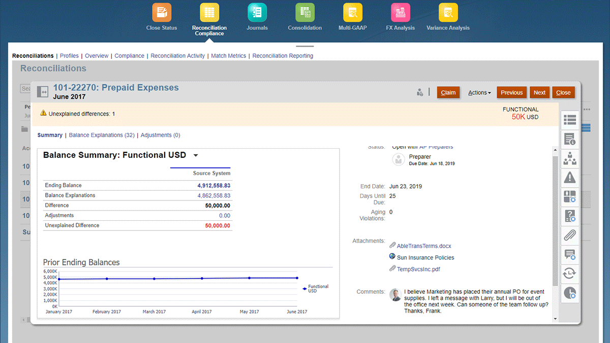 Gain workflow support for the account reconciliation process, including monitoring, reporting, and analysis. Facilitate communication across distributed organizations and ensure capture of all audit documentation.