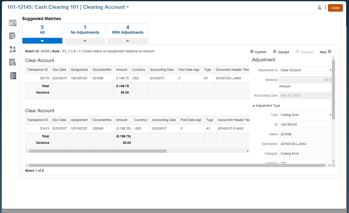 View suggested matches and decide whether to confirm or reject. Create manual matches subject to configurable constraints.