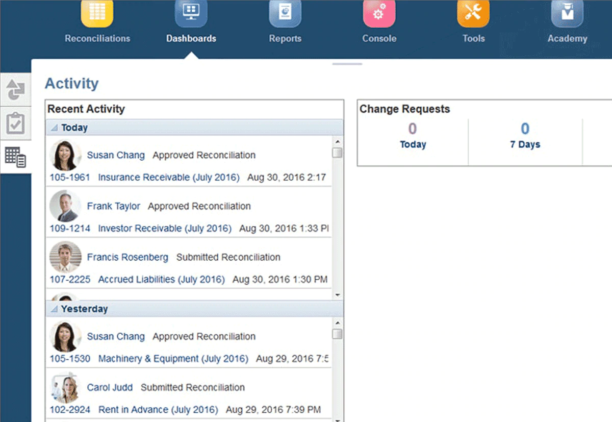 Gain workflow support for the account reconciliation process including monitoring, reporting, and analysis.