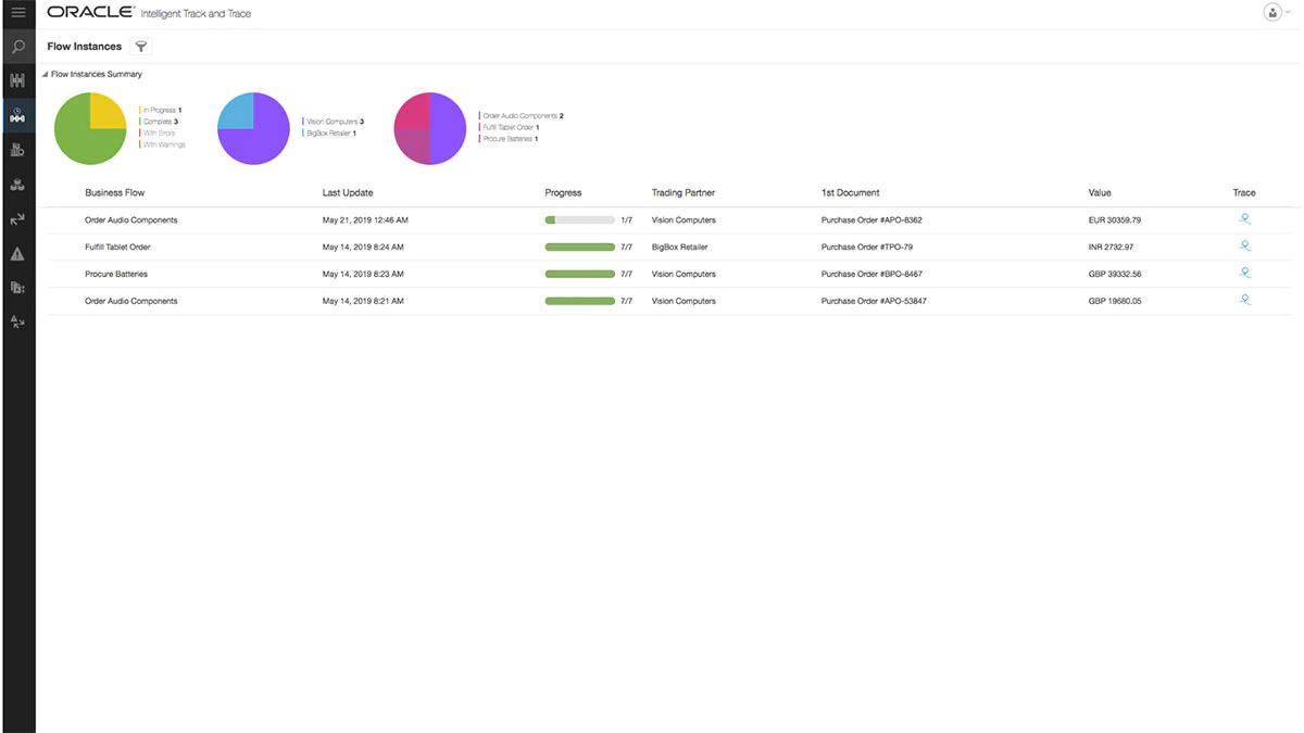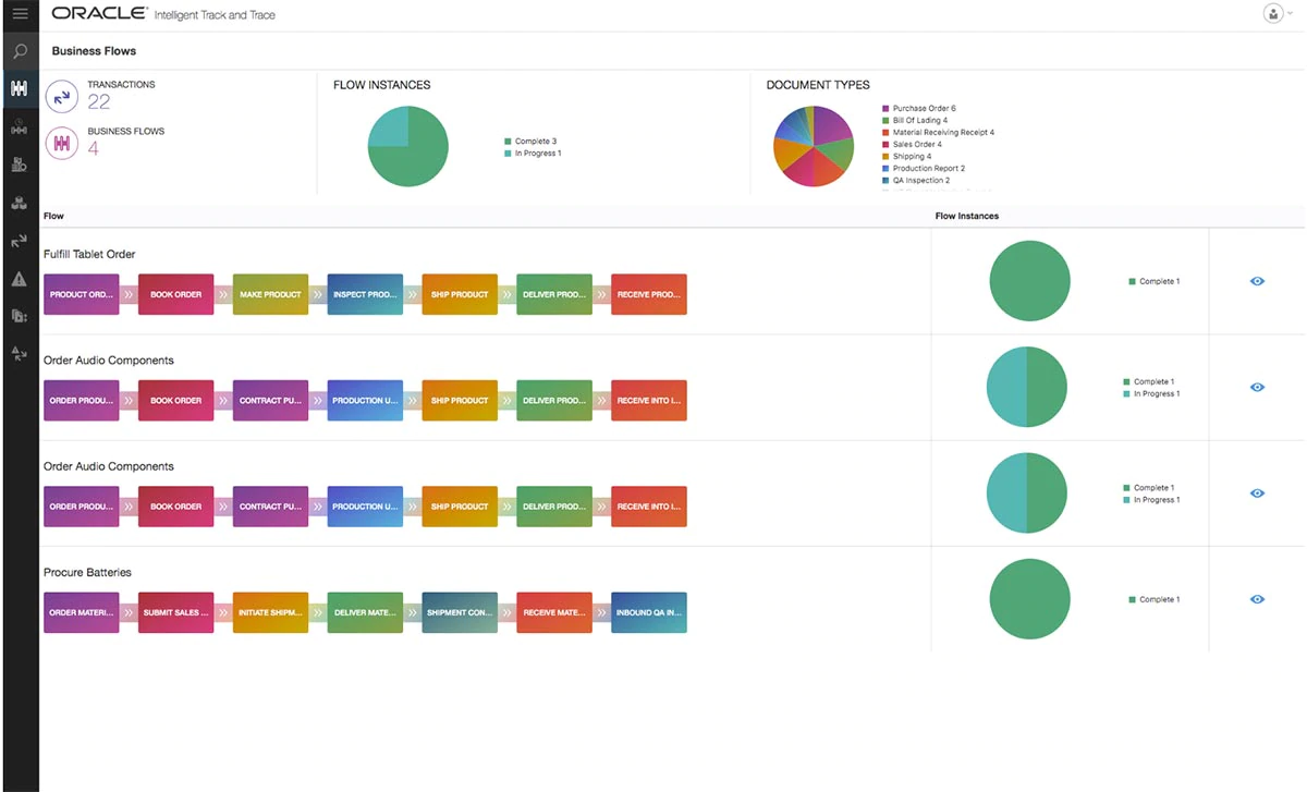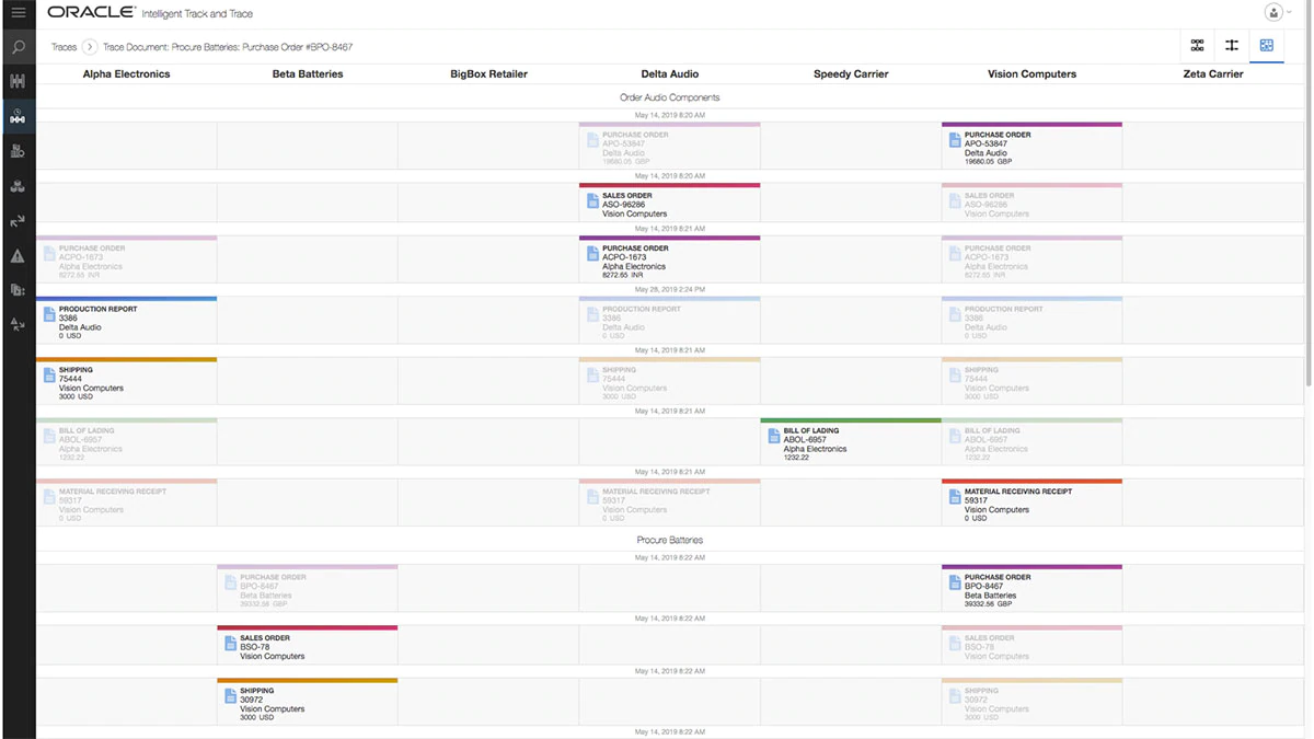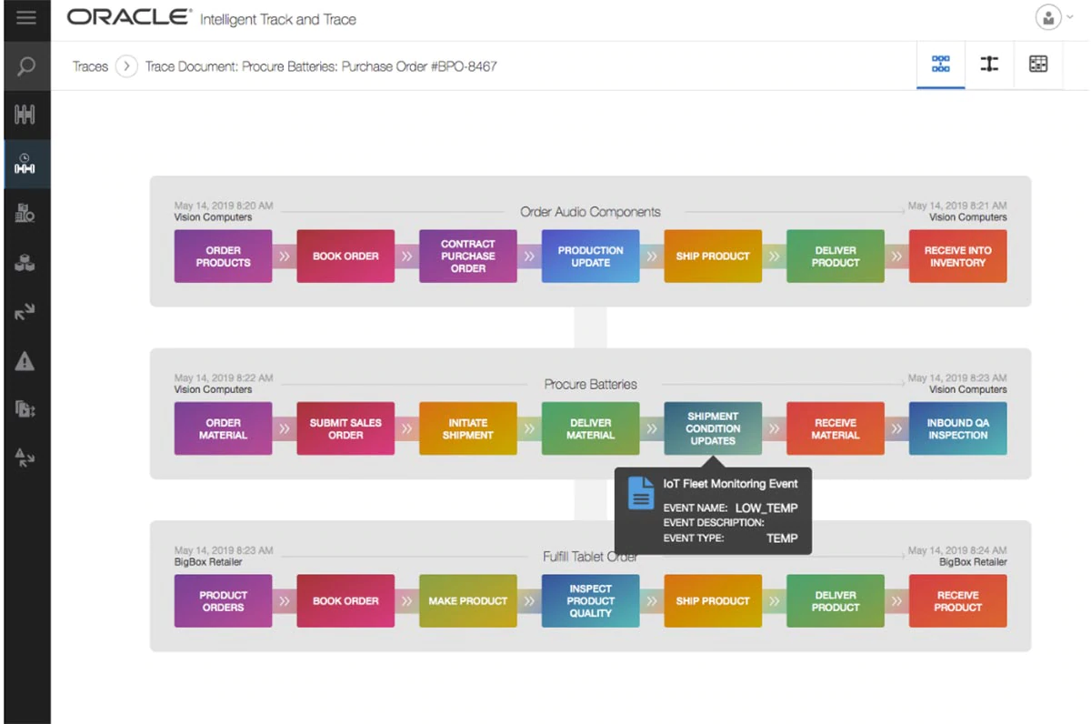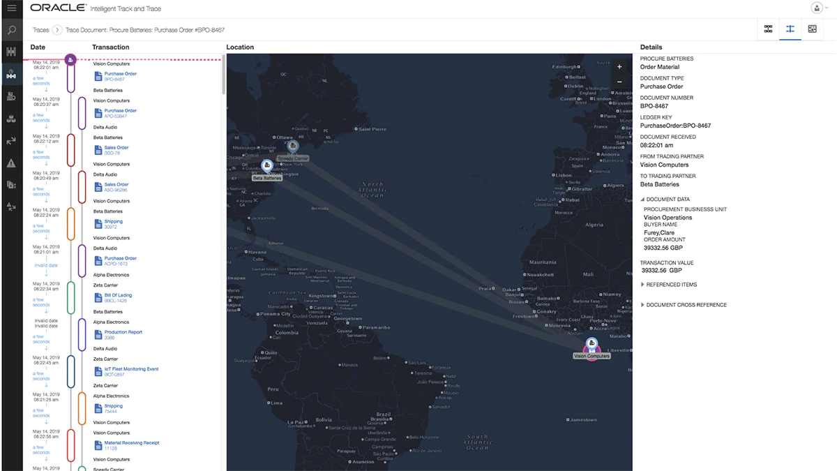 Oracle Intelligent Track and Trace is a prebuilt blockchain application that seamlessly connects with Oracle SaaS and PaaS as well as other cloud and on-premises third-party applications. It provides end-to-end visibility into multienterprise supply chain networks, enabling asset owners to track and trace things of value to achieve faster results and establish trust between participating trading partners.