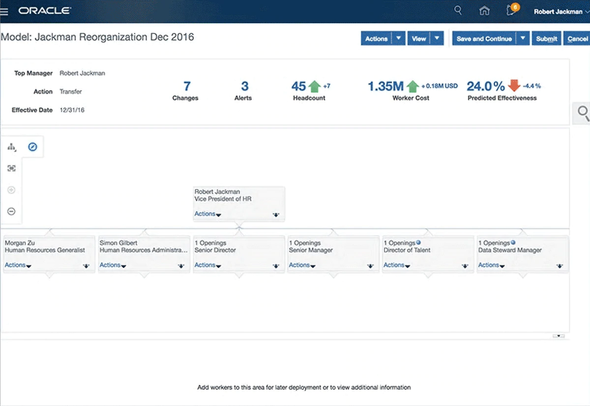 View the factors, costs, and impact of employee job transfers and reorganizations before they happen.
