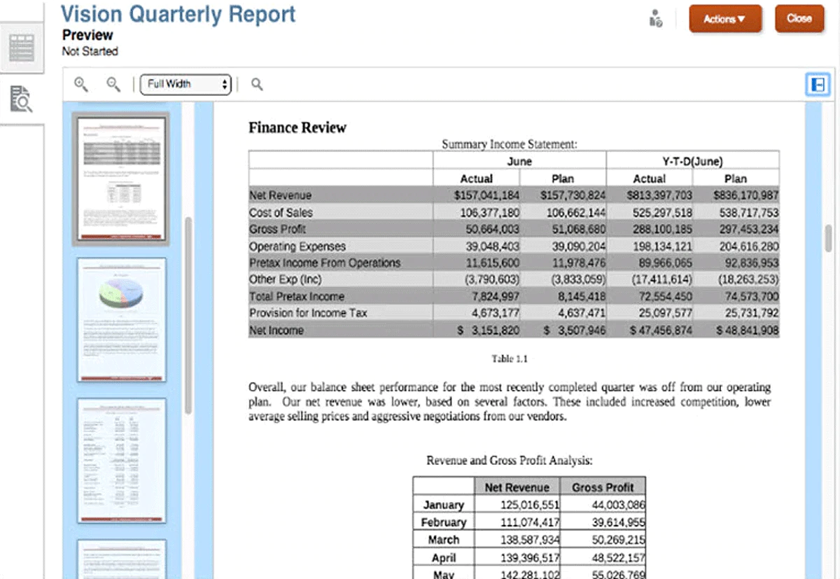 Combine financial statements and data with textual narrative to produce a single, stylized report package.