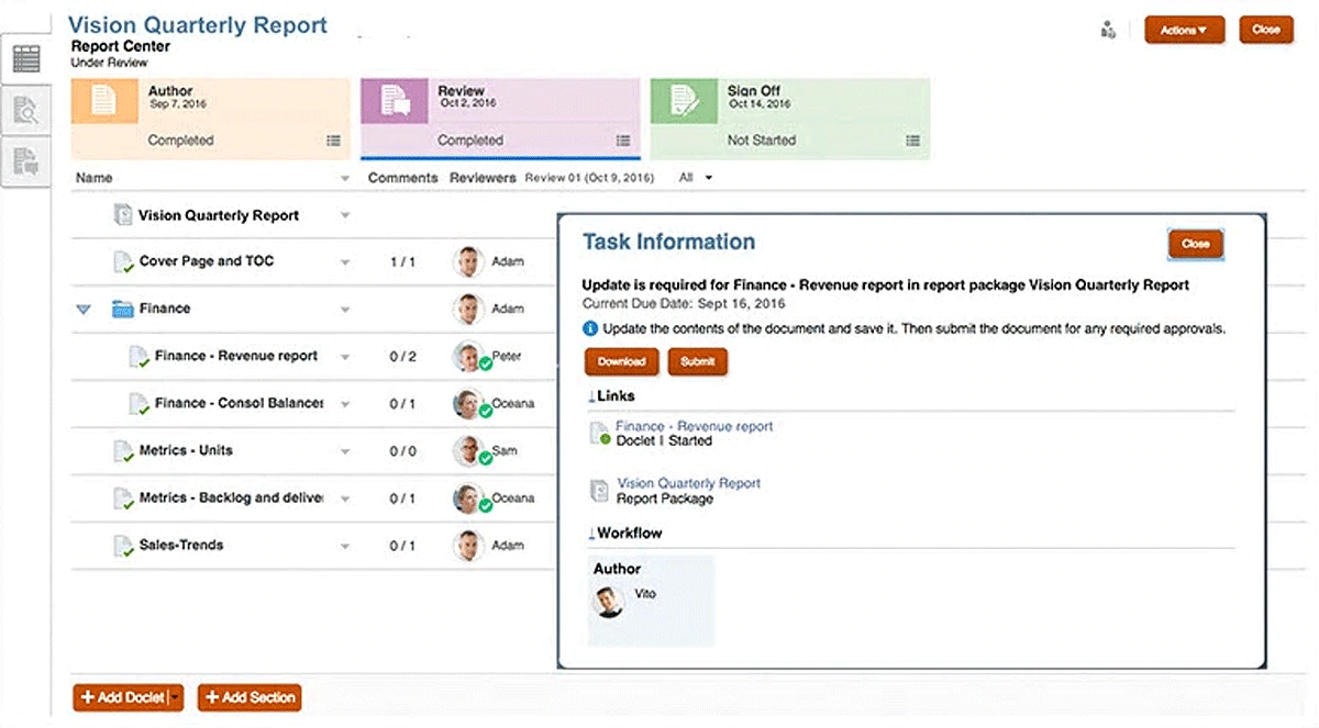 Manage the distributed development of report sections across multiple users.