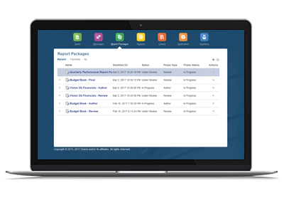 Use management reporting to create financial and managerial reports with charts and grids sourced from multiple Oracle EPM Cloud, Oracle Financials Cloud and/or Oracle Essbase sources, and embed report content into report package doclets with server-side updates.