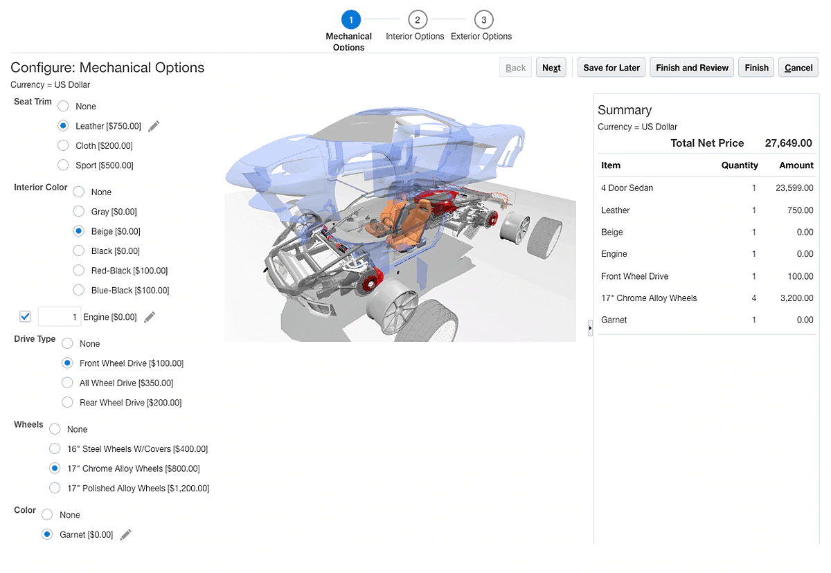 Oracle Configurator Cloud's dynamic runtime user interface provides an intuitive user experience to help choose the best product options for your customer's needs. As each option is selected, it is interactively validated by the Oracle Configurator Cloud's constraint engine. Options that become invalid can be dynamically hidden or shown as invalid based on the user interface's display condition rules. Images can be used for option selections in place of standard controls, and visualization elements can be added to further portray the product being configured.